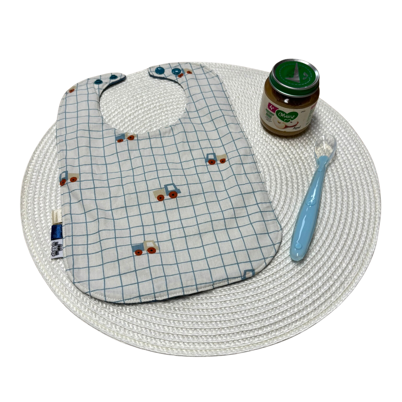 Het slabbetje is op 3 verschillende maten te gebruiken door middel van drukknopen (halsomtrek 24-27cm).